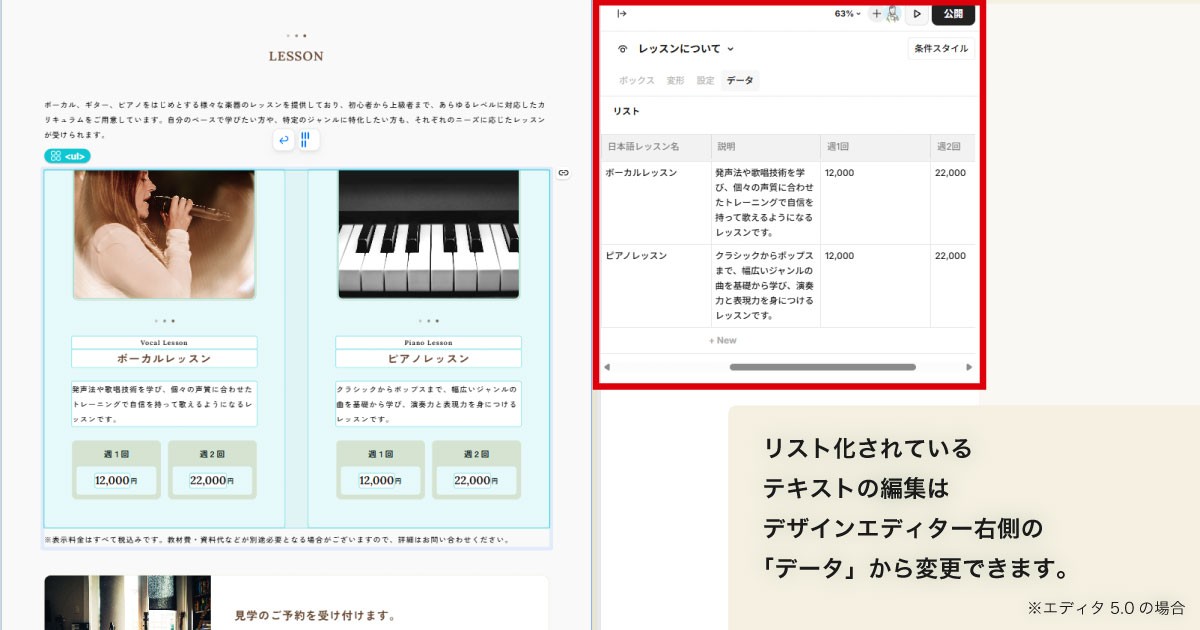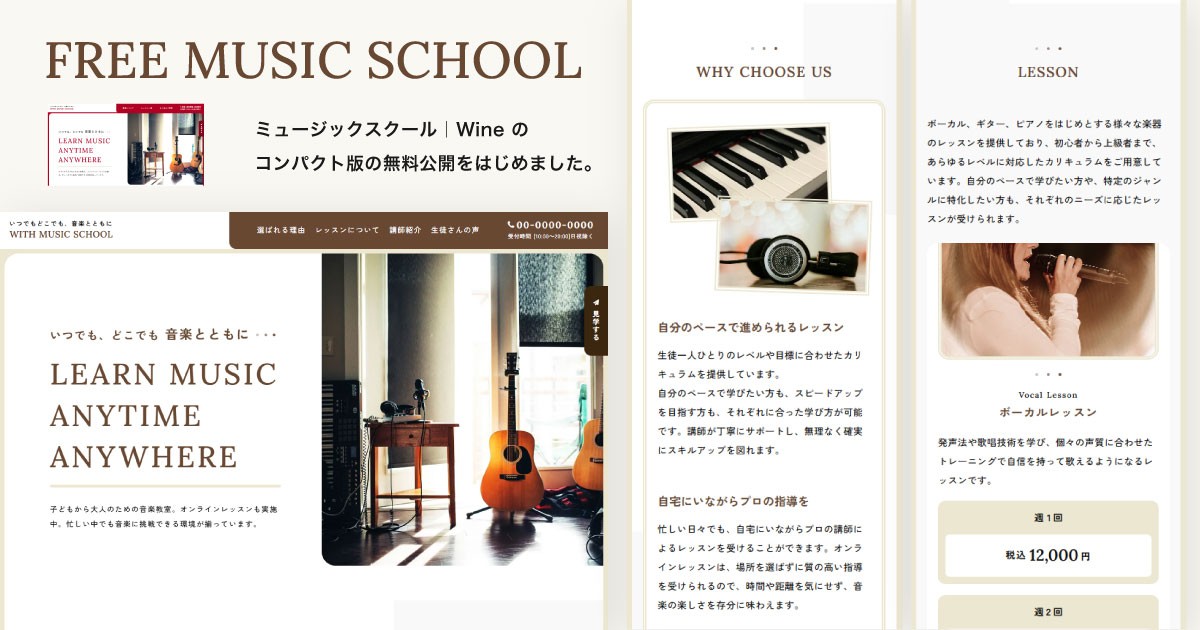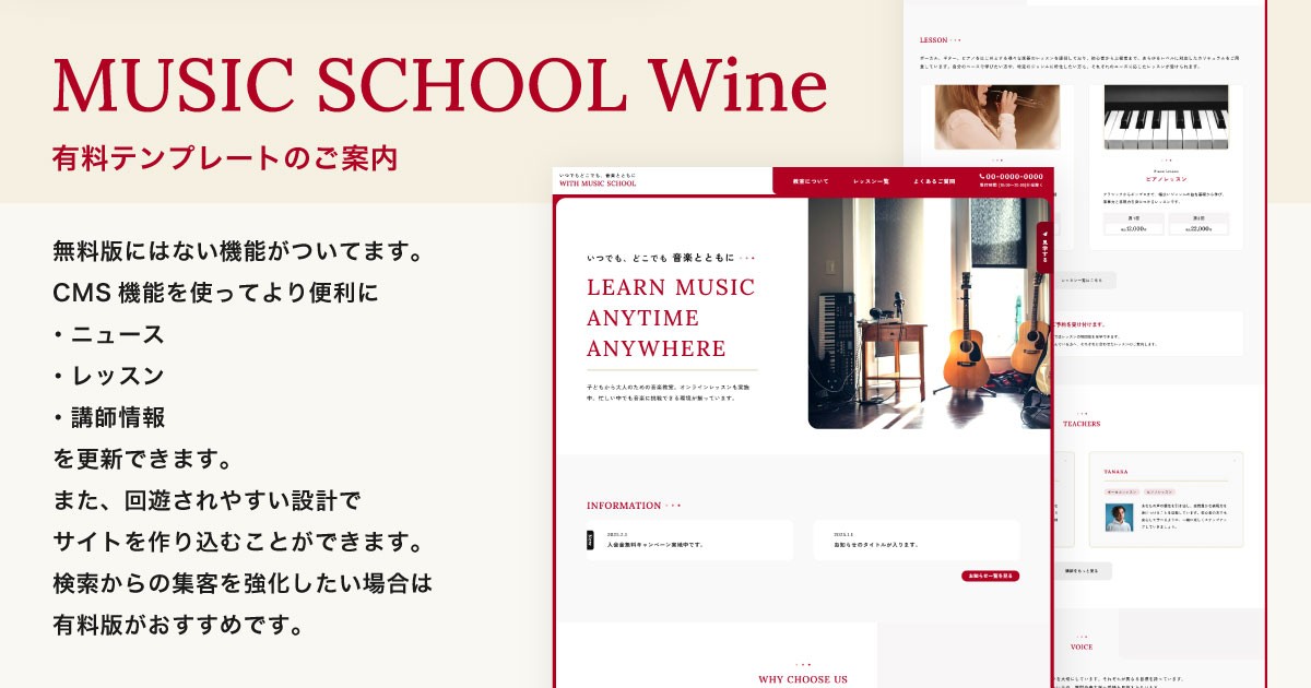 ミュージックスクールのテンプレートには、CMS機能を使って作り込むサイトに適した有料版がございます。購入後の公開率90%越え(2026年1月現在)のテンプレートで、編集者にとっても公開まで挫折しにくい設計になっています。