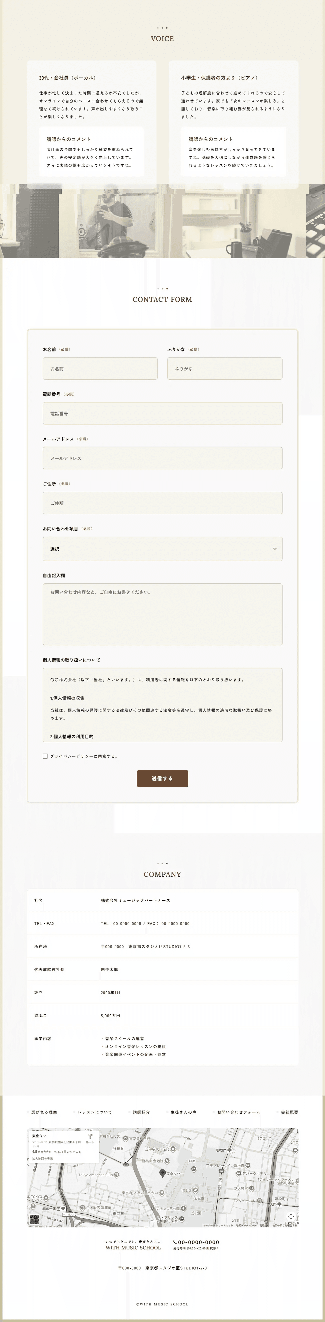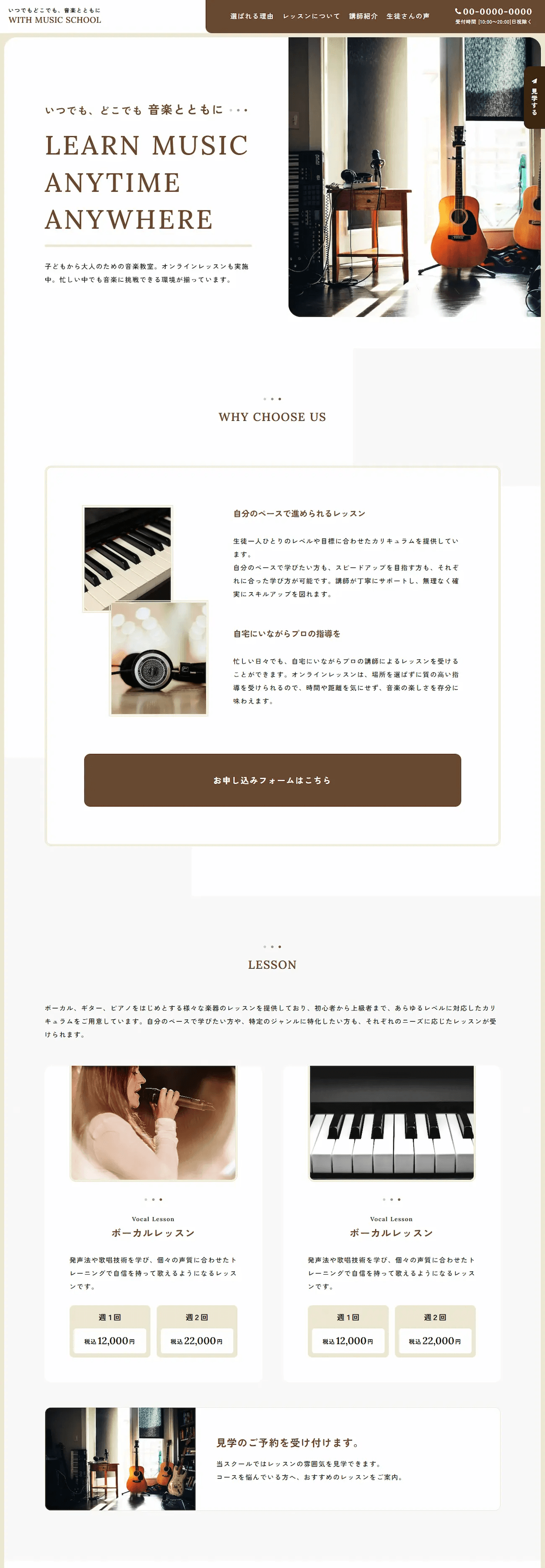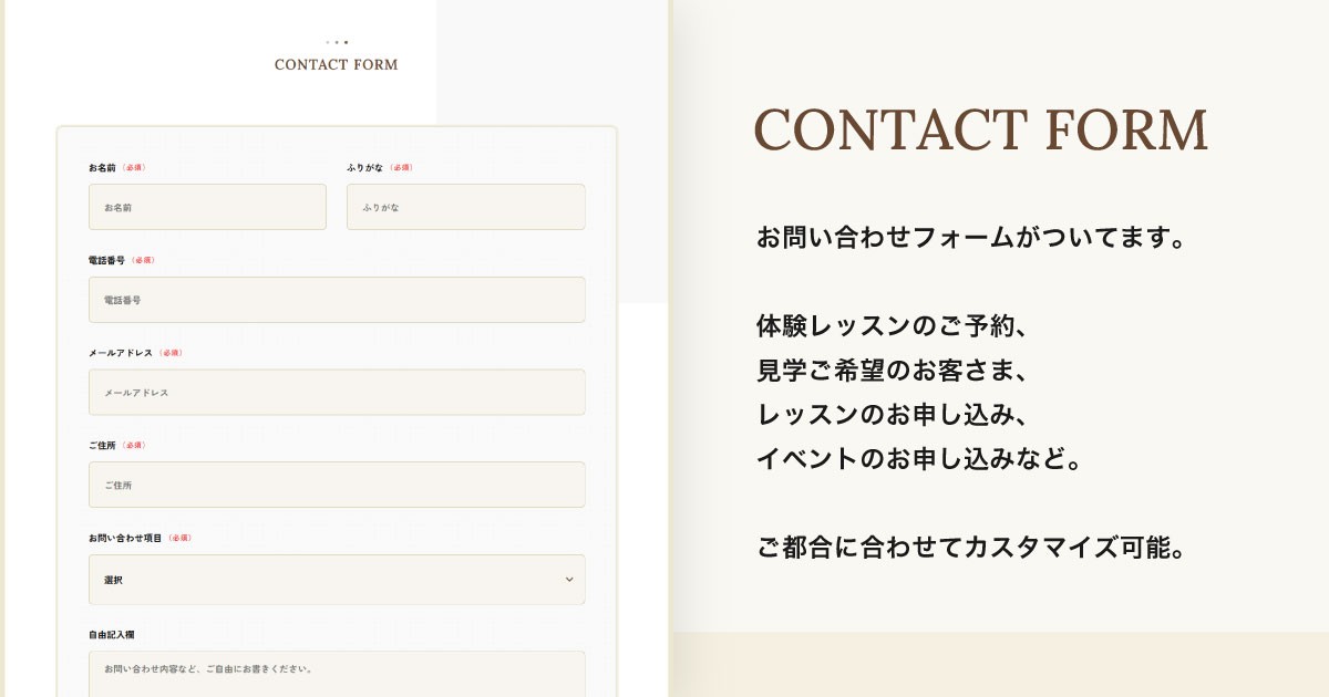 スクールホームページ向けのコンパクトなテンプレートです。選ばれる理由、レッスンについて、講師紹介、生徒さんの声をリスト機能でサクサク更新。お問い合わせフォームも完備。
